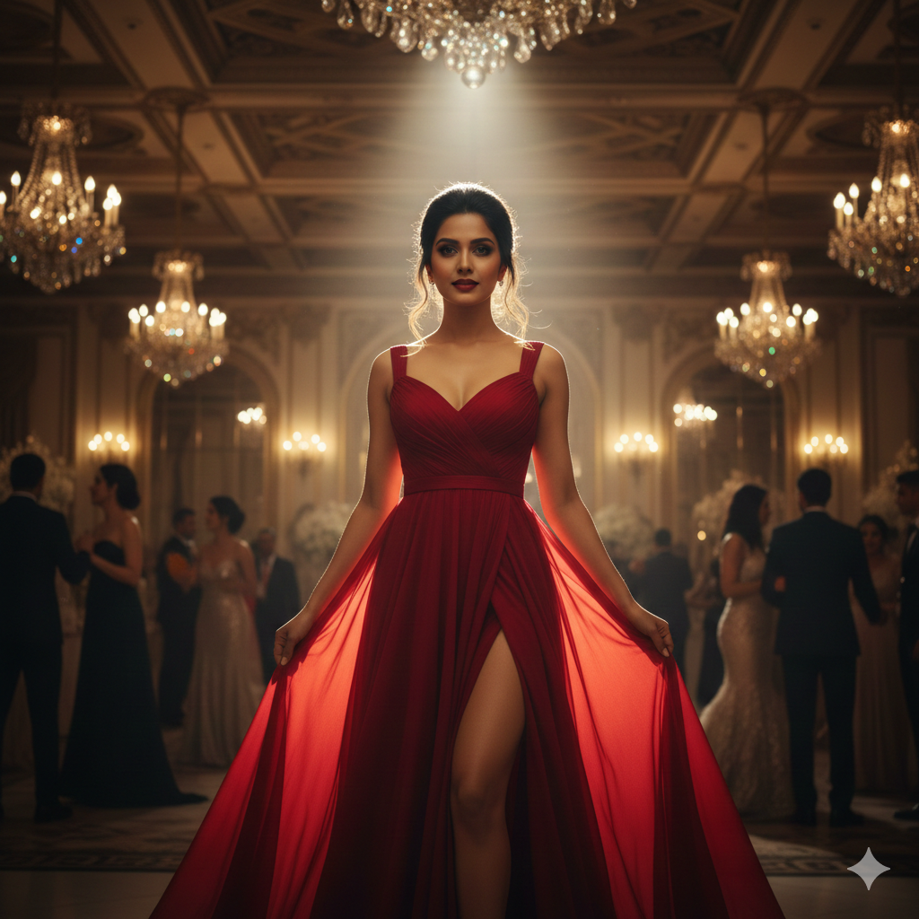 A gorgeous Indian girl wearing a stylish red evening dress, sleek hairstyle, soft spotlight, luxury ballroom background, premium portrait style, high-contrast cinematic touch.