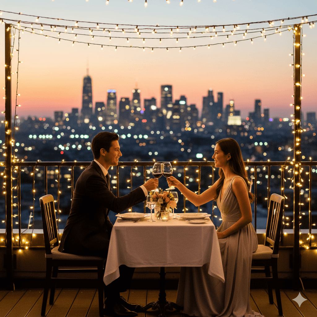 Prompt:A couple at a romantic rooftop dinner table with fairy lights and a city view, toasting with wine glasses. Sophisticated, elegant, sharp, full-body.