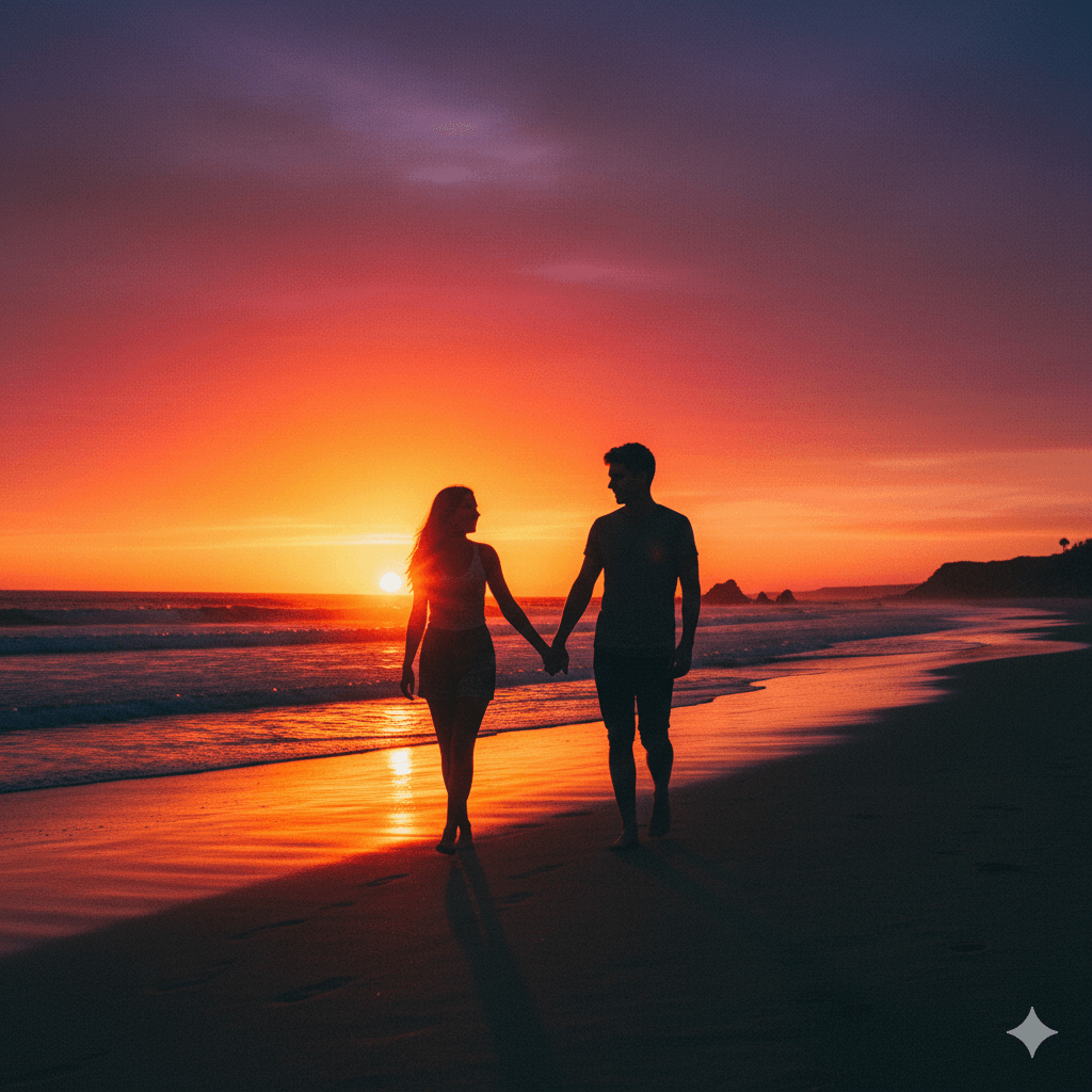 Prompt:A full-body silhouette of a young couple holding hands, walking on a beach during a vibrant orange and purple sunset. Backlit, cinematic, ultra-HD.