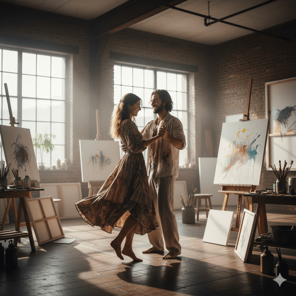 Prompt:A couple dancing in a spacious, sunlit artist's studio with blank canvases and paint splatters. Bohemian vibe, high contrast, creative connection.