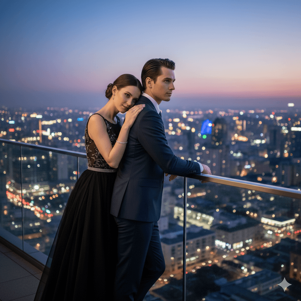 Prompt:A stylish couple leaning on a high-rise balcony railing at dusk, looking at a glittering city skyline. Modern, romantic, clean, sharp, HD aesthetic.