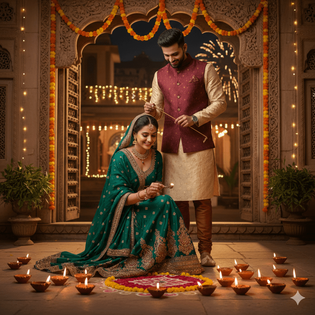 Prompt:A couple in traditional Indian attire (lehenga, sherwani) lighting diyas for Diwali. Vibrant, warm light and shadows, detailed full-body portrait.