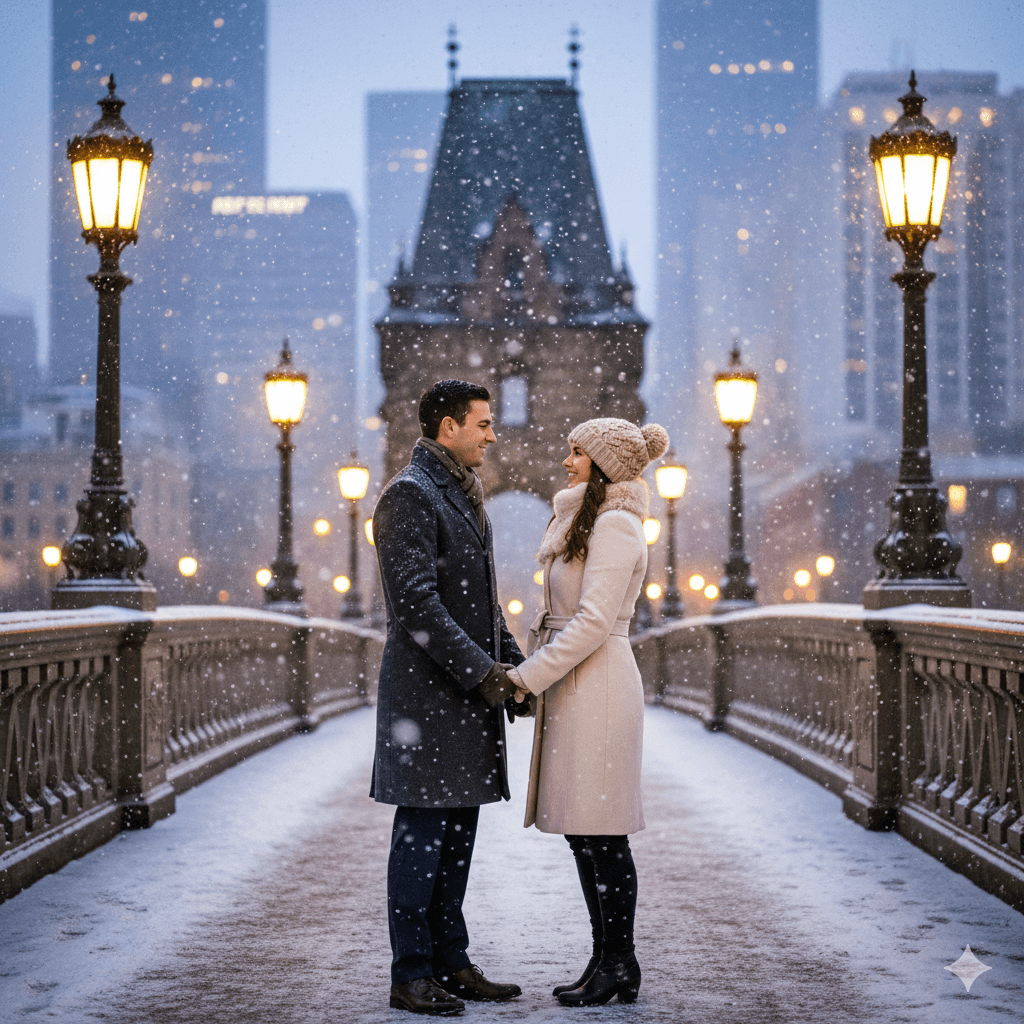 Prompt:A couple in chic winter coats standing on a historic bridge as soft snow falls. The city glows in the background. Serene, romantic, full-body, HD snow details.