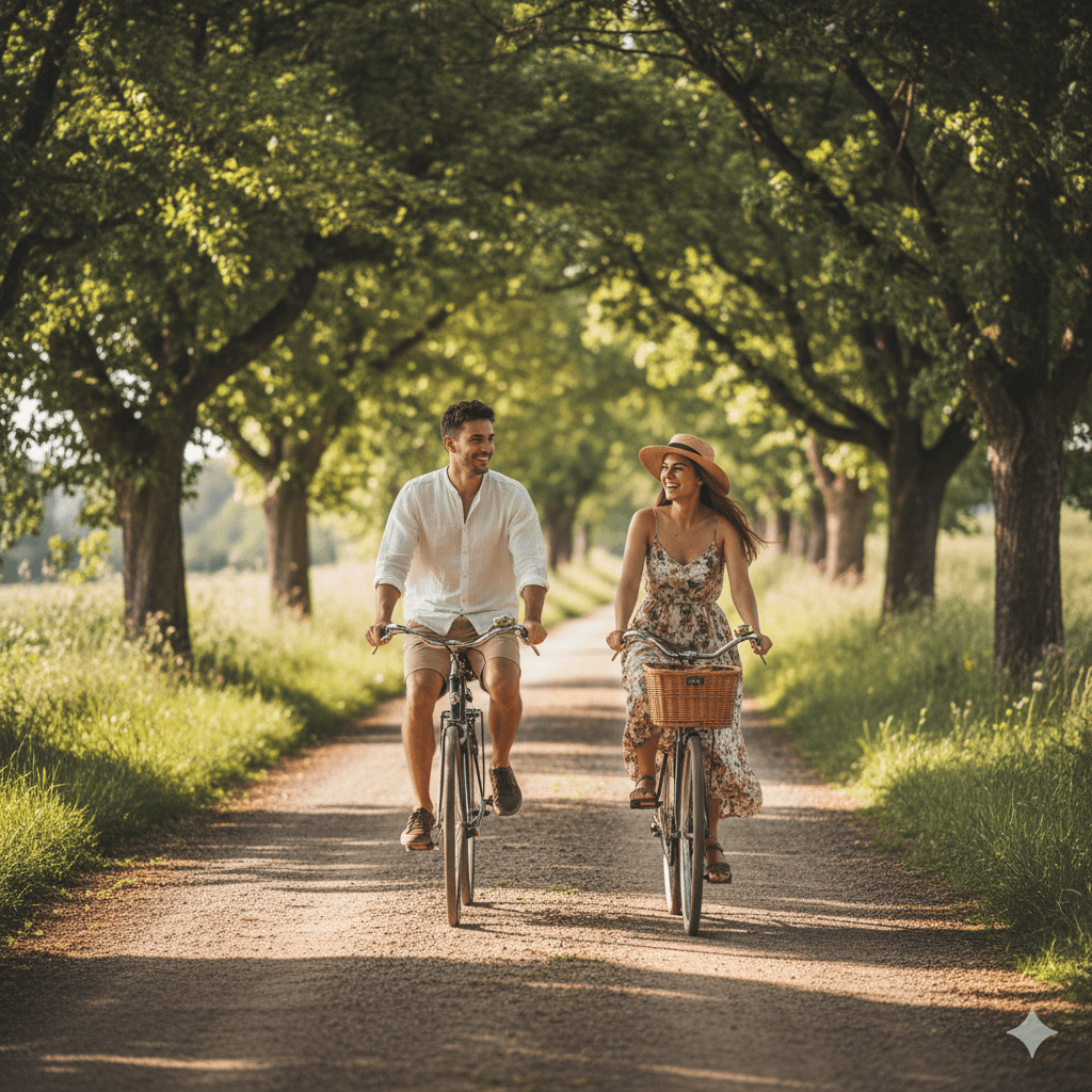 Prompt:A couple on vintage bicycles cycling down a peaceful, tree-lined country road in golden summer light. Dynamic, rustic romantic feel, full-body action shot.