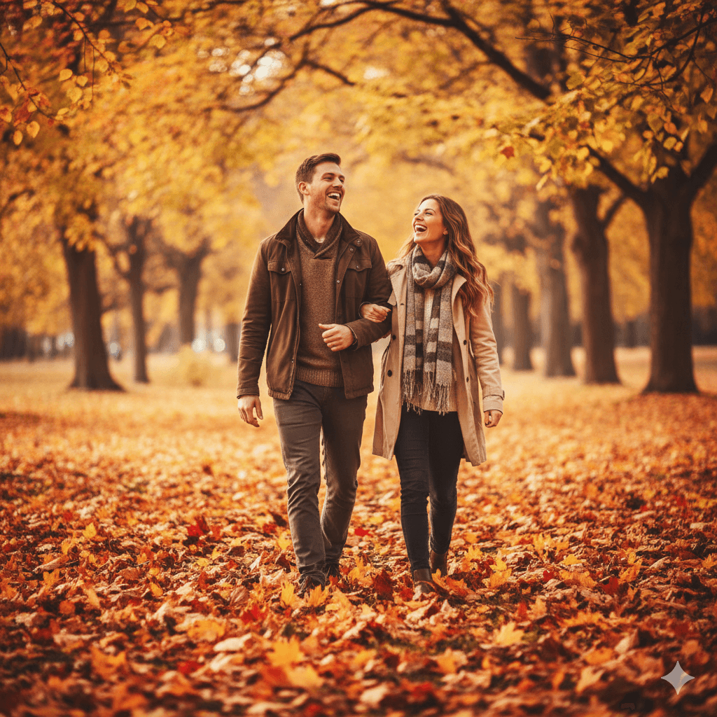 Prompt:A couple walking and laughing through a park covered in golden and red autumn leaves. Crisp, full-body shot, shallow depth of field, sharp focus.