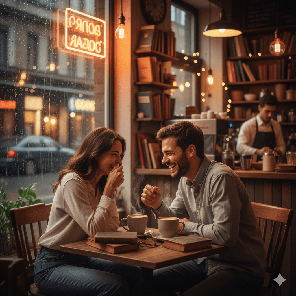 Prompt:A couple leaning in and laughing over coffee in a cozy, vintage café. Books on the table, rainy window in background. Warm, inviting tone, detailed composition.