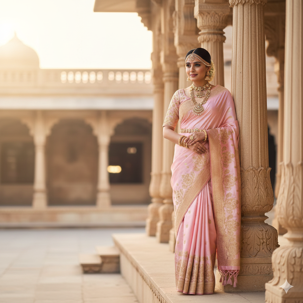 “Elegant Indian woman in pastel pink silk saree, intricate gold embroidery, traditional bridal jewelry, standing beside palace pillars, gentle sunset light, soft royal vibe portrait.”