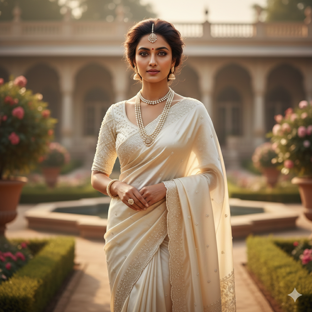 “Beautiful Indian woman in ivory silk saree with pearl embellishments, elegant hairstyle, soft-focus palace garden background, warm natural light, calm majestic queen-like portrait.”