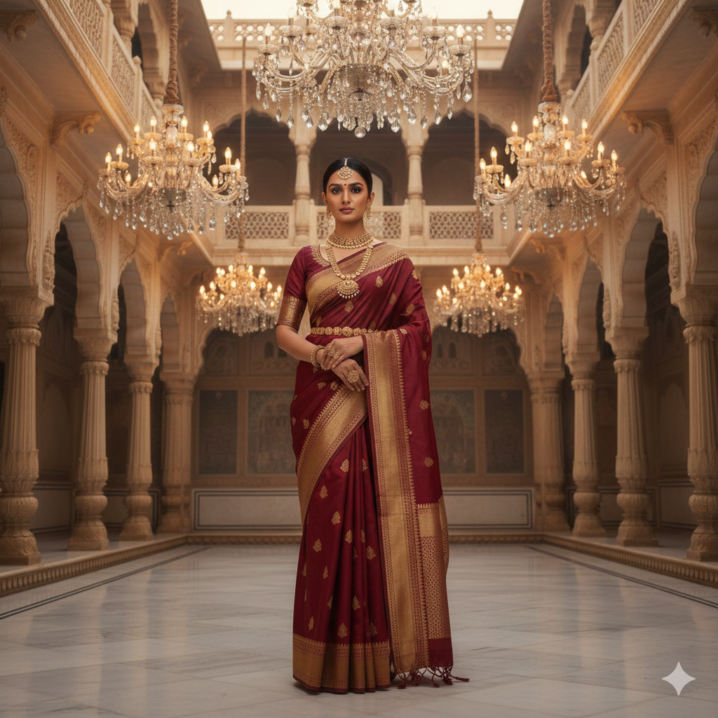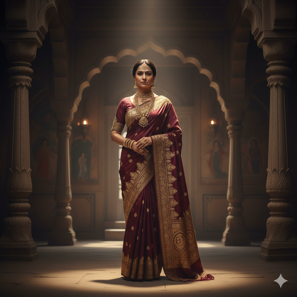 “Regal Indian woman in deep ruby-red silk saree with antique gold borders, standing in a marble palace courtyard, chandeliers above, graceful queen-like pose, soft warm royal light, ultra-detailed HD portrait.”