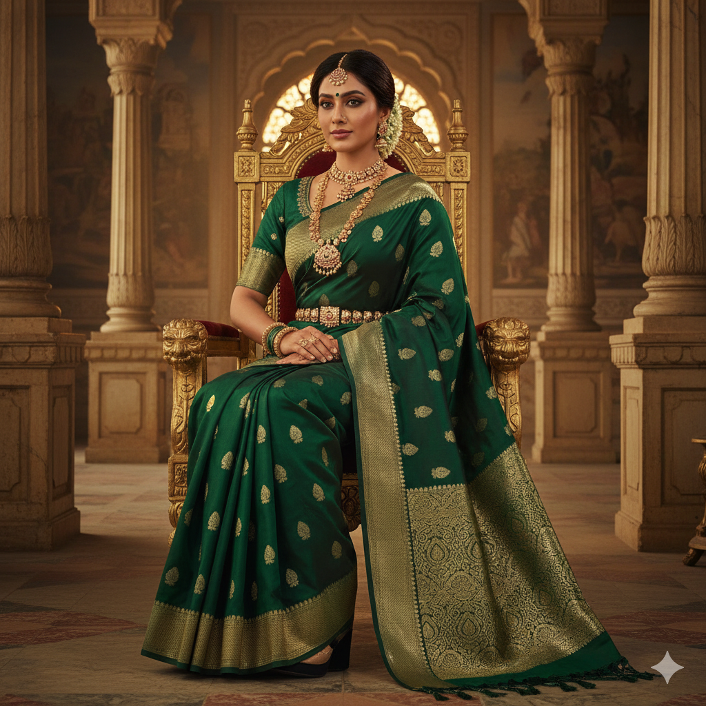 “Indian woman dressed in emerald silk saree with handwoven motifs, royal gold necklace, grand throne room background, soft golden glow on face, premium luxury Indian portrait.”
