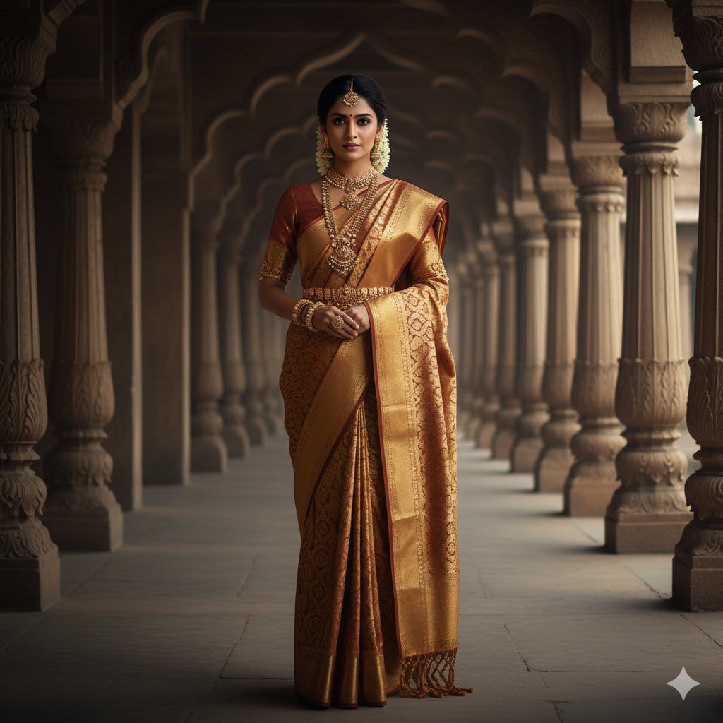 “Beautiful Indian woman wearing a golden brocade saree, heavy temple jewelry, majestic posture, long palace corridor with carved arches, dramatic soft shadows, cinematic royal portrait.”