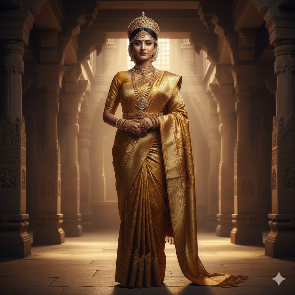 “Indian woman wearing a rich golden saree with heavy zari work, crown-inspired jewelry, ancient palace temple backdrop, glowing ambient light, queen-like Indian bridal portrait.”