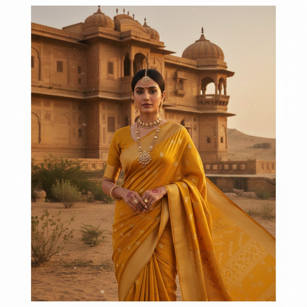 “Elegant Indian woman in mustard silk saree standing outdoors during golden hour, warm glowing light on face, classic ethnic jewelry, peaceful aesthetic portrait.”