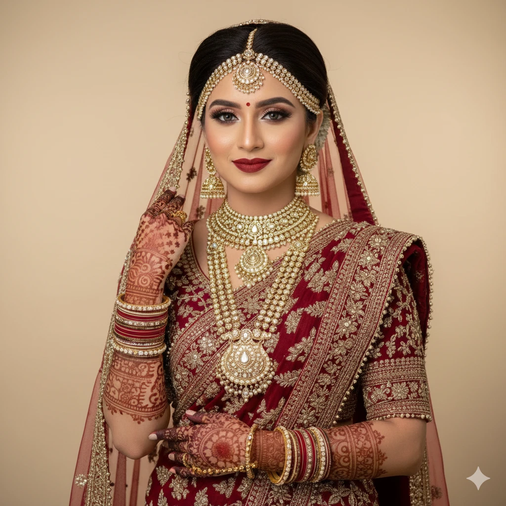 A stunning bridal portrait featuring an Indian bride in a heavy embroidered saree, intricate mehendi, statement jewelry, soft glam lighting, premium makeup, clean studio backdrop, ultra-detailed wedding aesthetic.