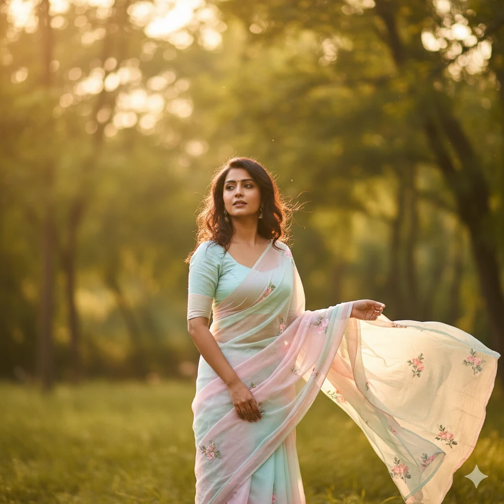 A natural outdoor portrait of an Indian woman in a pastel-color saree standing in soft sunlight, gentle breeze creating motion in the fabric, lush background, warm tones, ultra-realistic DSLR look.
