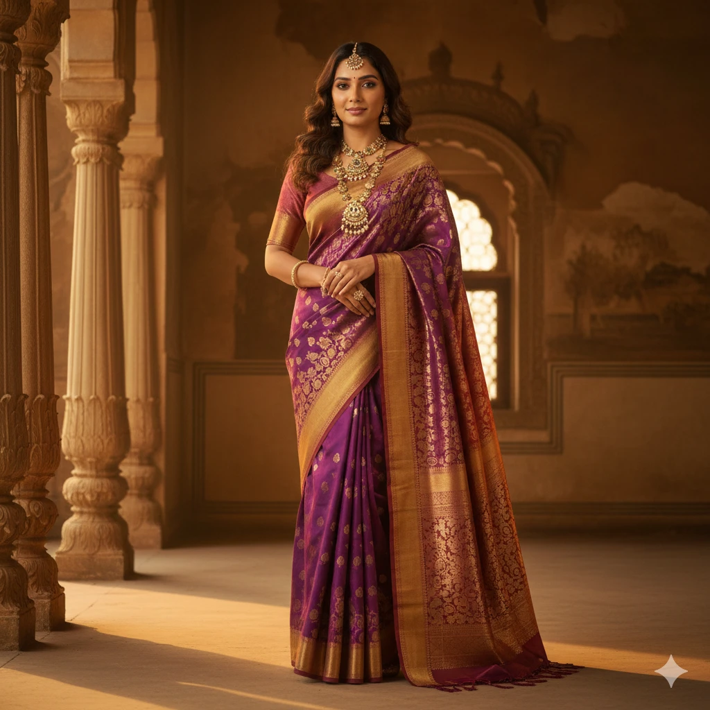 A majestic portrait of a royal Indian woman dressed in a Banarasi silk saree, antique gold jewelry, vintage palace background, dramatic light from the side, sharp details, regal pose, rich colors, luxurious and traditional visual style.