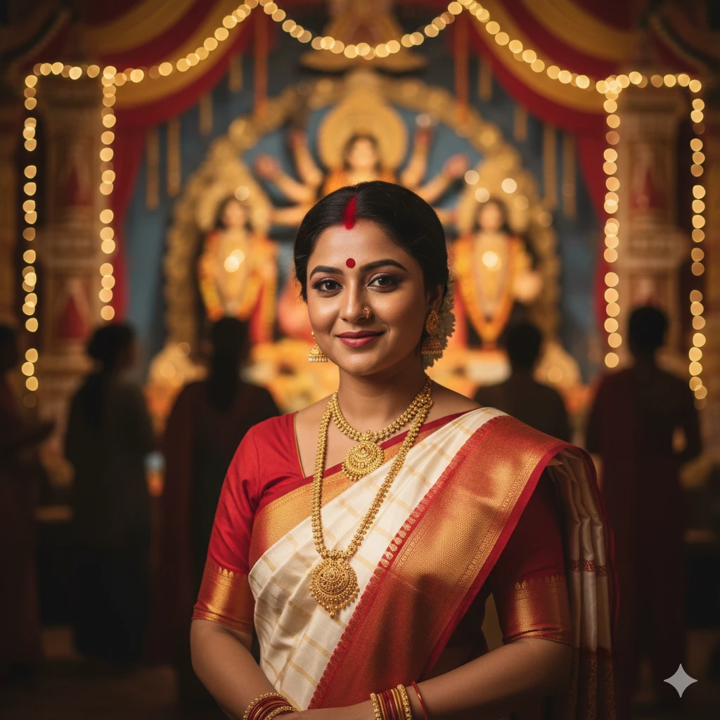 A festive portrait of a Bengali woman wearing a red-and-white traditional saree, big bindi, gold ornaments, subtle sindoor, cultural background, warm lighting, detailed skin texture, cinematic Indian festival vibe.