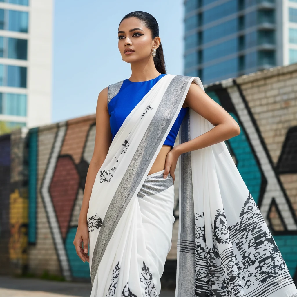 A trendy fashion portrait of a young Indian woman in a designer contemporary saree, sleek hairstyle, minimalist makeup, bright editorial lighting, crisp focus, stylish urban background, magazine-quality photo.