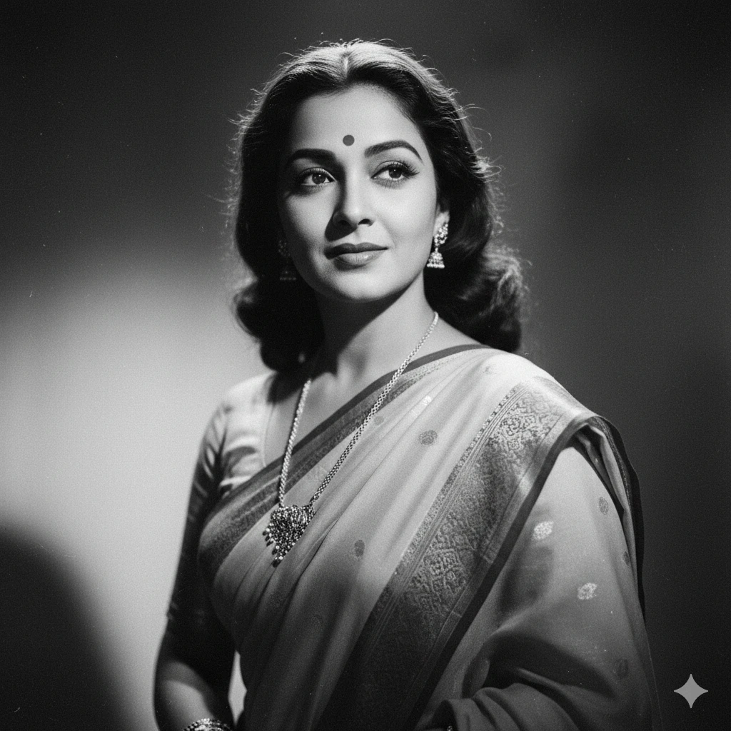 A classic black and white portrait of an Indian woman in a saree, high contrast, artistic grain, retro Bollywood style, elegant expression, timeless vintage photography mood.
