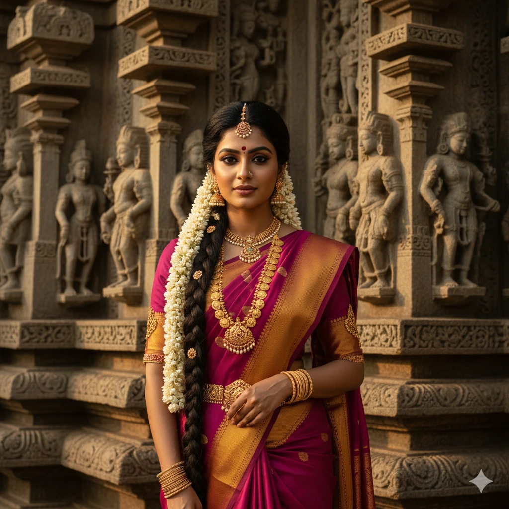 A divine South Indian woman in a traditional Kanjivaram silk saree, jasmine flowers adorning her hair, temple jewelry, backdrop of ancient stone carvings, golden sunlight, high-resolution cultural portrait.