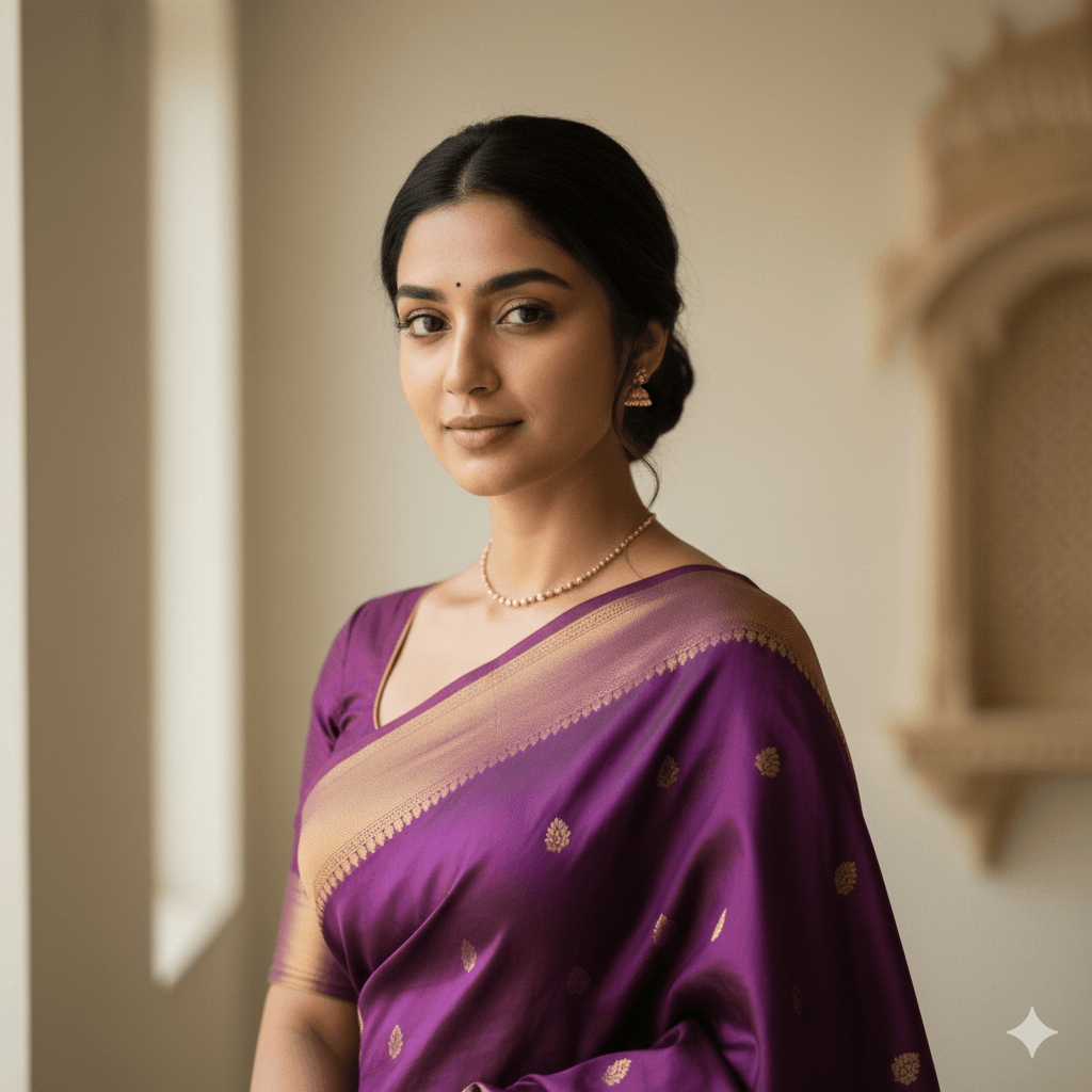 “Woman in purple silk traditional saree, classic bun hairstyle, subtle gold necklace, soft cinematic lighting, royal Indian portrait style.”