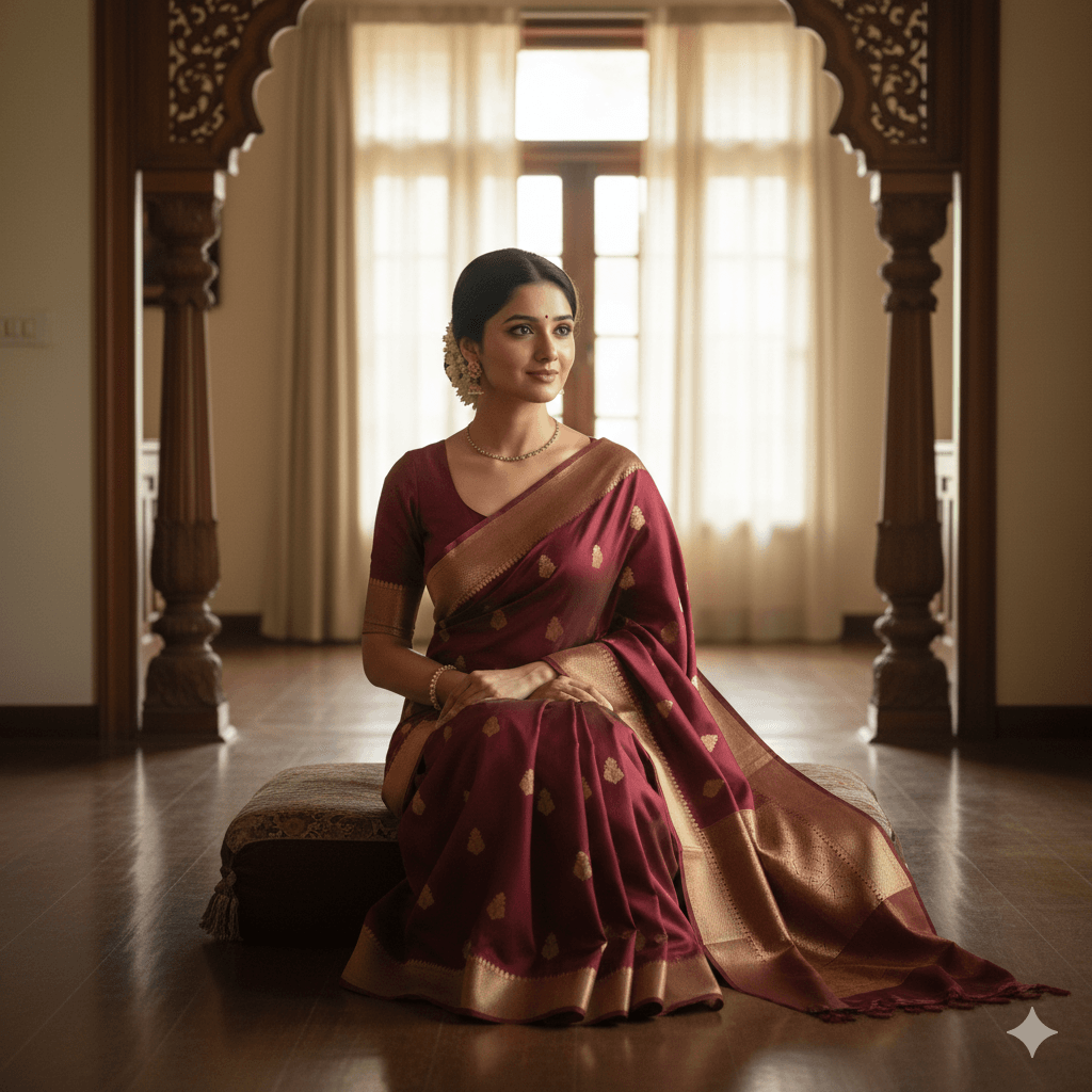 “Indian woman wearing maroon silk saree, sitting inside heritage home, wooden textures, diffused sunlight, graceful cultural pose, highly detailed portrait.”
