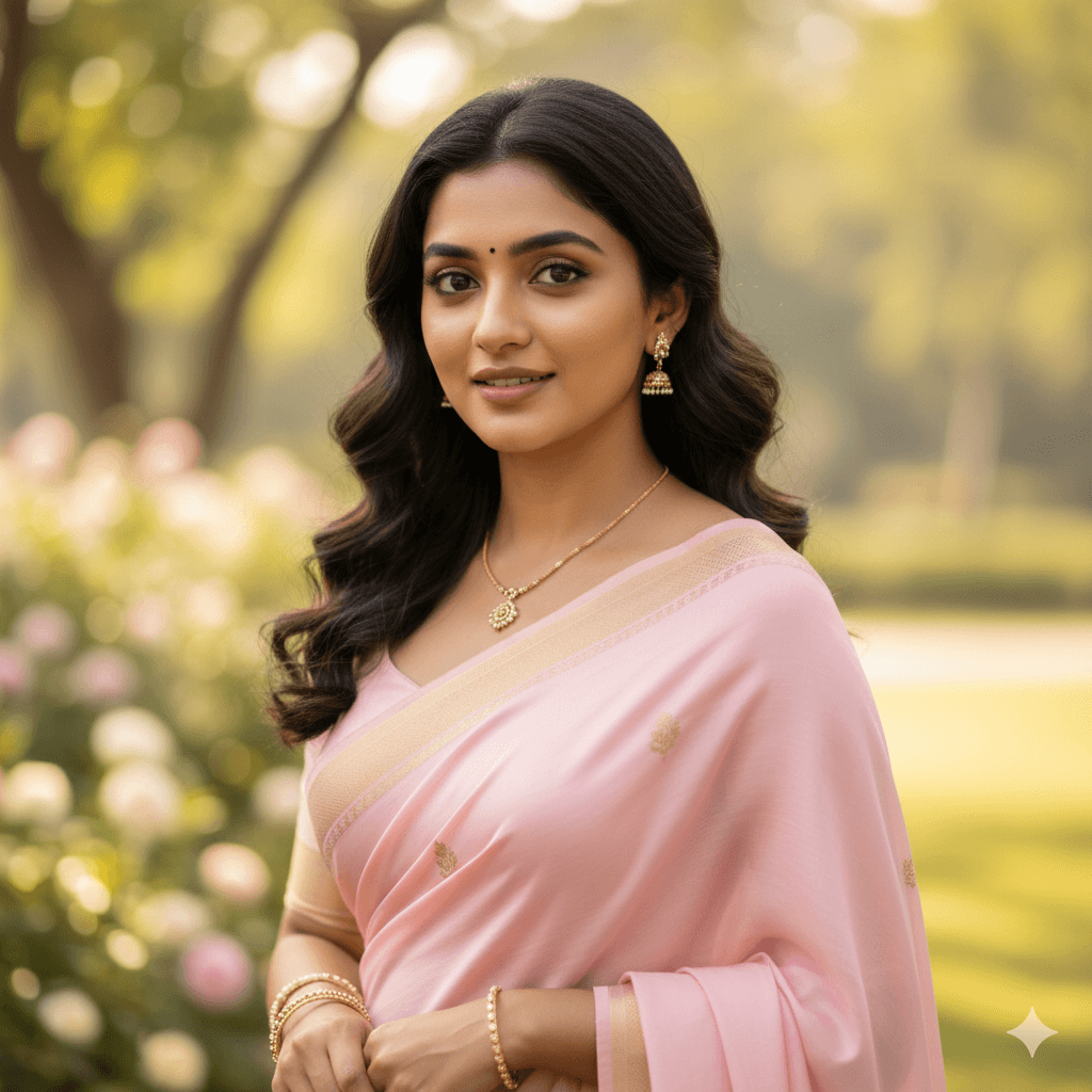 “Girl in pastel pink traditional saree, soft natural lighting, delicate jewelry, smooth glowing skin, gentle smile, ultra-clear 4K portrait.”
