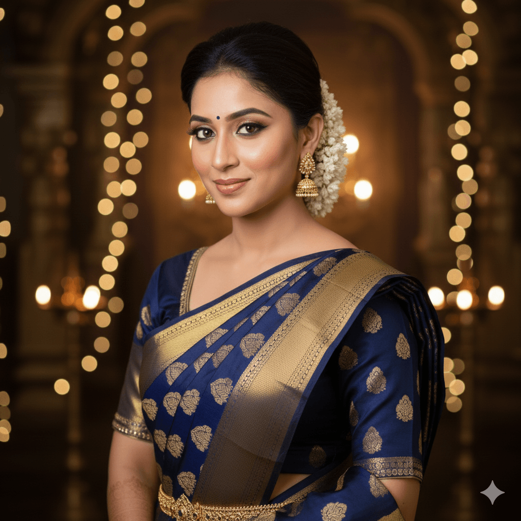 “Indian woman in navy blue embroidered traditional saree, festive warm lights, gold earrings, soft bokeh background, elegant HD portrait.”
