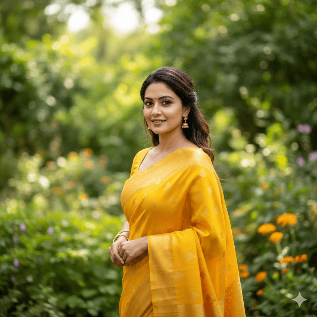 “Beautiful Indian girl in bright yellow traditional saree, green garden background, daylight glow, natural feminine expression, HD ethnic portrait.”