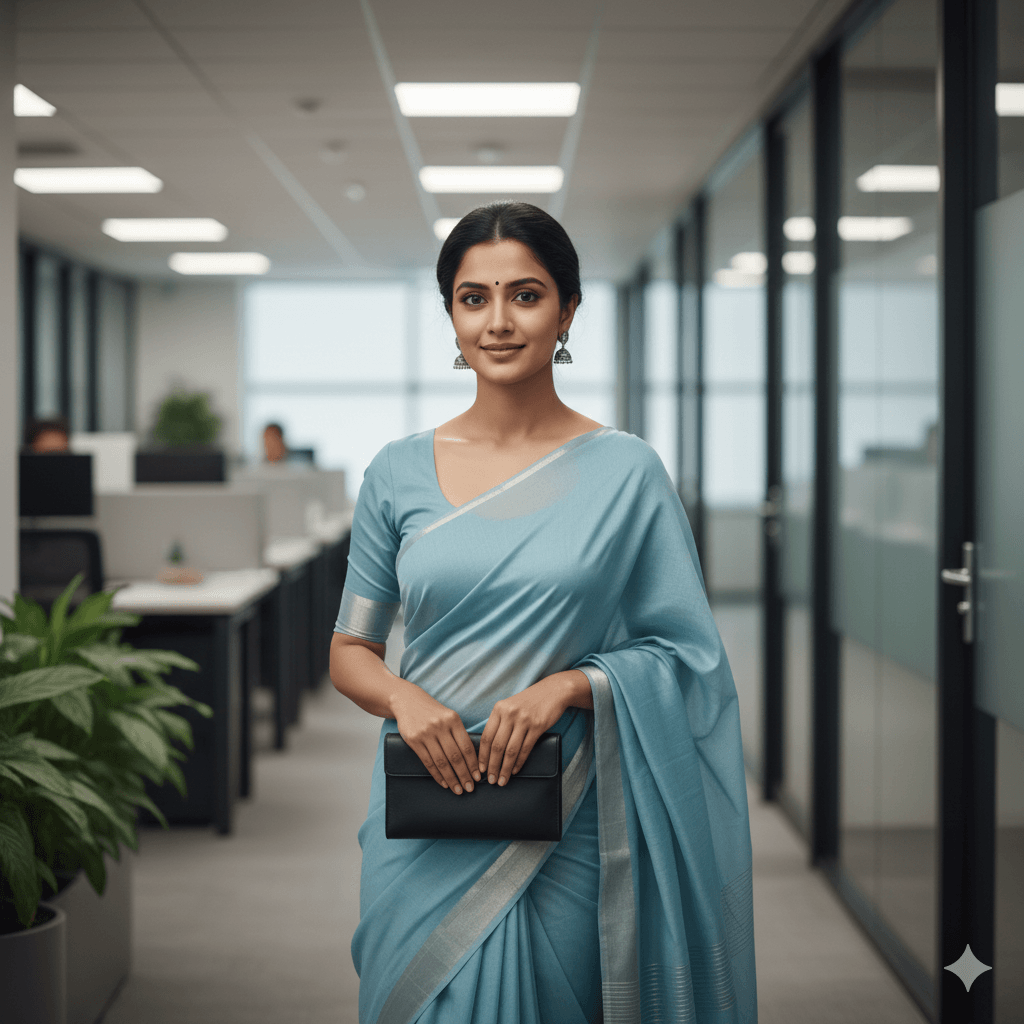 Indian woman in a simple cotton saree, office corridor background, soft neutral light, minimal makeup, classy professional Indian aesthetic, ultra-realistic 4K.