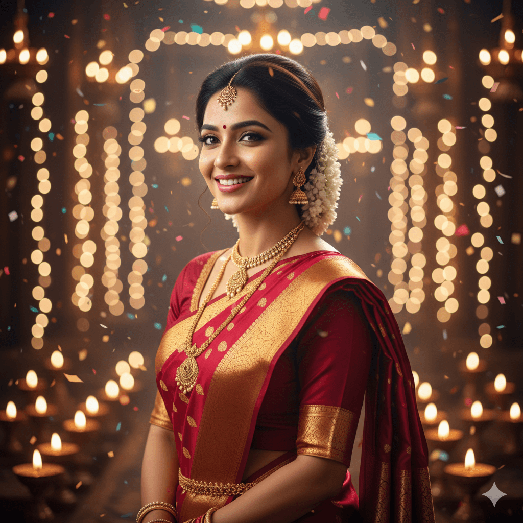 Indian woman in a bright maroon saree, decorative festival lights in background, soft bokeh, elegant smile, warm festive aesthetic, ultra-realistic 4K portrait.