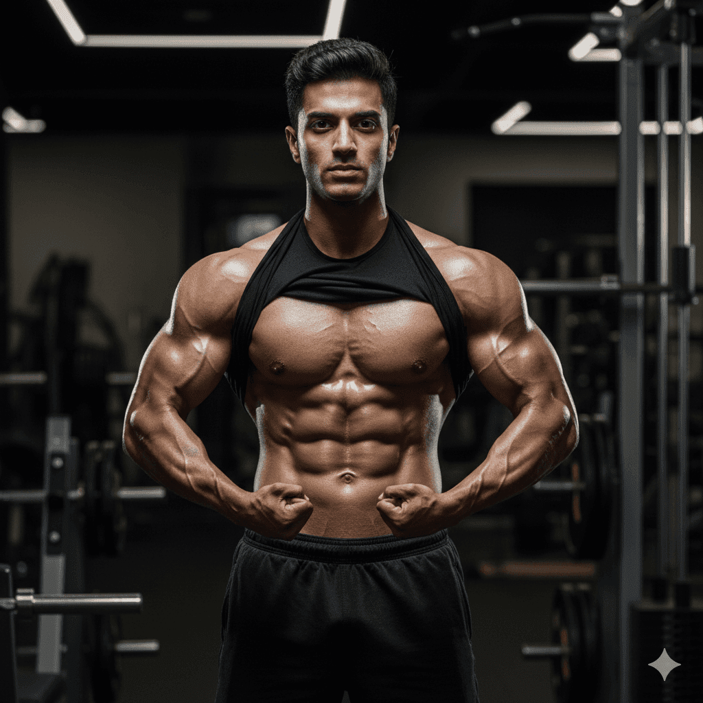 “Indian fitness model boy in gym lighting, visible muscle definition, sweat shine, sharp highlights, dramatic shadows, 4K hyper-realistic physique shot, motivational fitness portrait.”