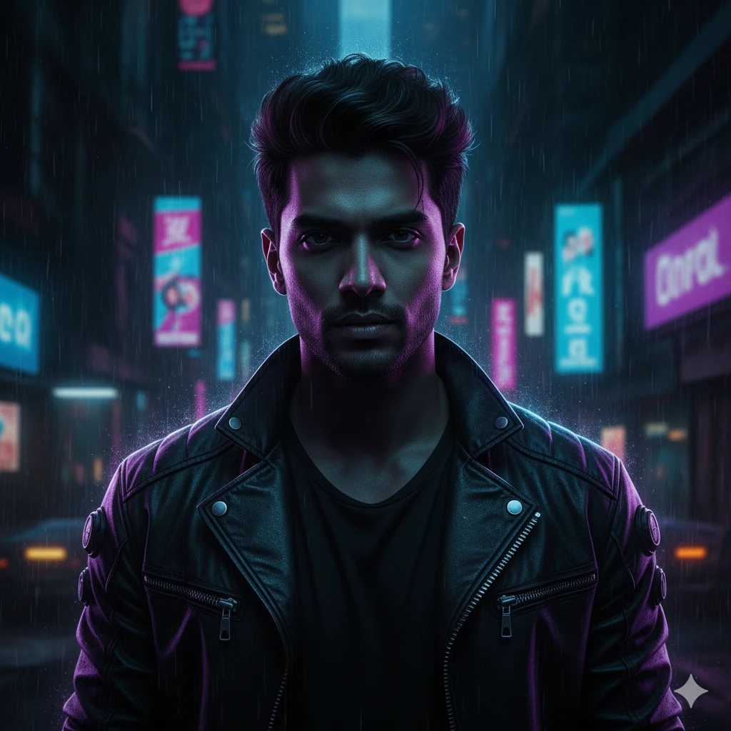“Moody portrait of a boy in black outfit, neon edge lighting, dark cinematic background, sharp details, dramatic shadows, high contrast, ultra-HD 4K, cyberpunk aesthetic.”