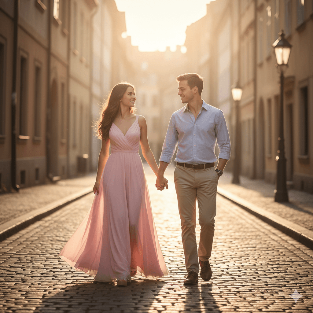 - Lighting & Mood: Golden hour, soft shadows, cinematic lighting — romantic look ke liye zaruri hai.