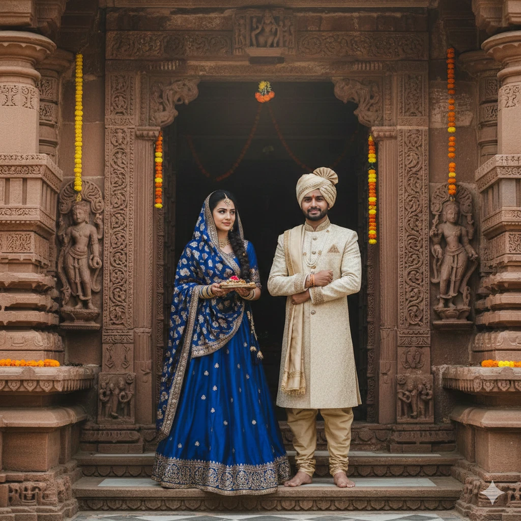“Full-body Indian couple standing at a temple entrance, traditional clothing, soft diffused daylight, respectful and calm mood, cultural aesthetic, ultra-detailed 8K quality.”