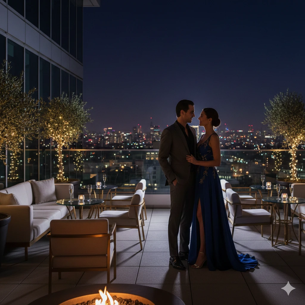 “Full-body couple on a rooftop lounge at night, city lights glowing behind, classy outfits, modern luxury setting, cinematic blue-gold lighting, romantic mood, premium HD clarity.”