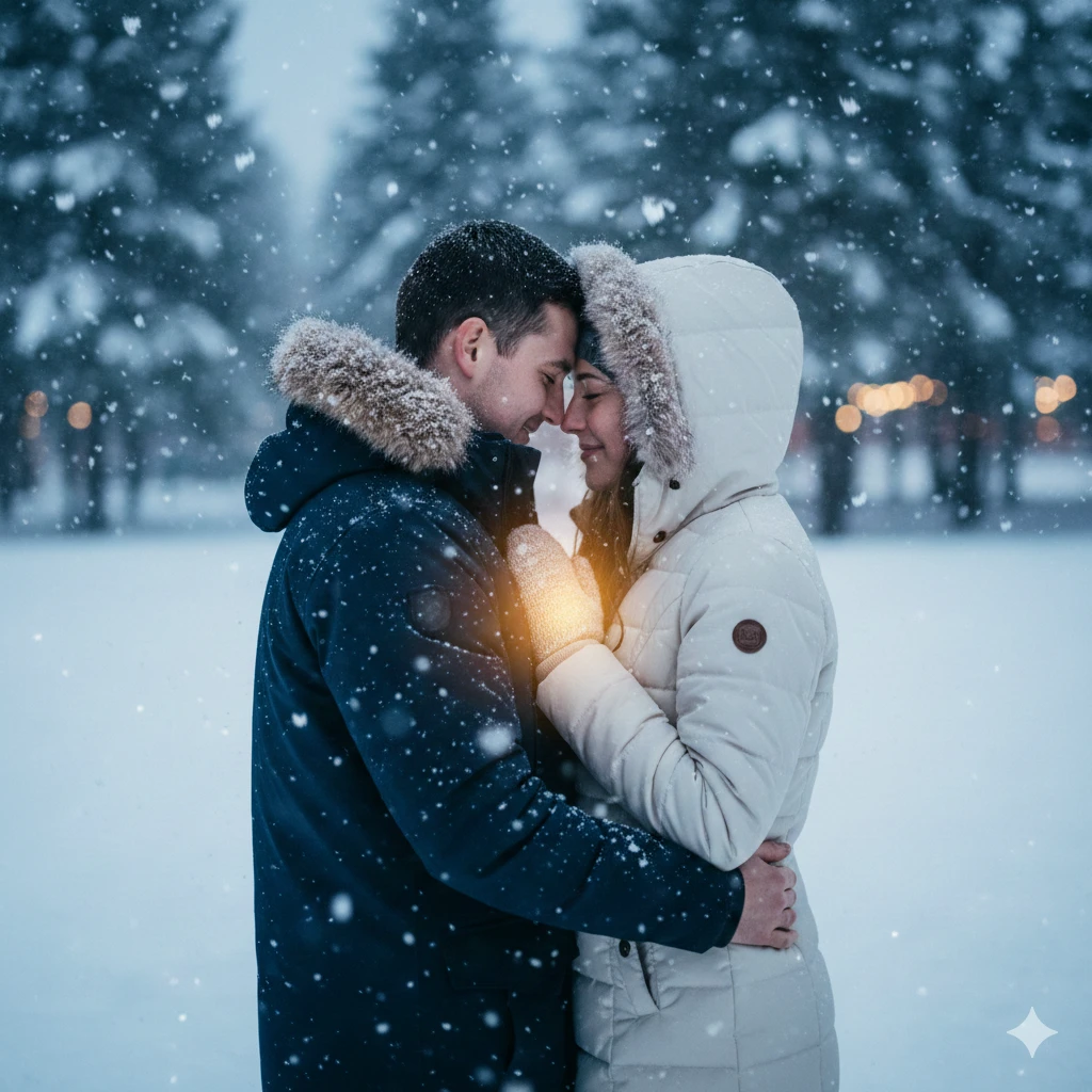 “Full-body couple in snowfall, winter jackets, holding each other warmly, visible snowflakes, cold blue lighting, romantic warm expressions, HD hyper-realistic shot.”