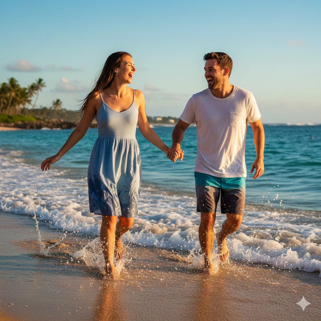 “Full-body couple running playfully on shoreline, water splashing around feet, joyful expressions, sunny day, vibrant tones, HD crisp clarity, natural movement captured beautifully.”