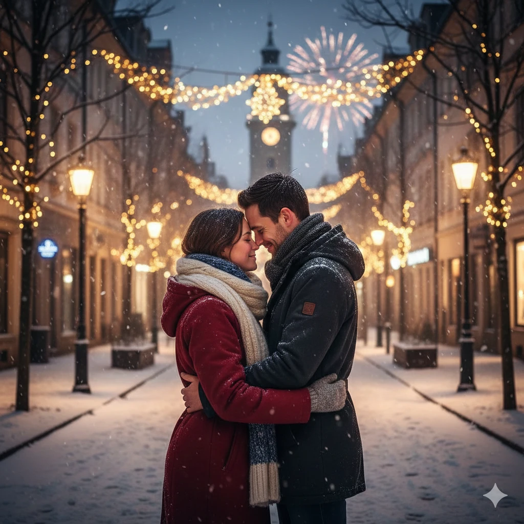 A romantic New Year winter scene with a couple hugging closely, warm coats and scarves, soft golden lights, cozy winter night atmosphere, emotional and intimate vibe, ultra-realistic photo.