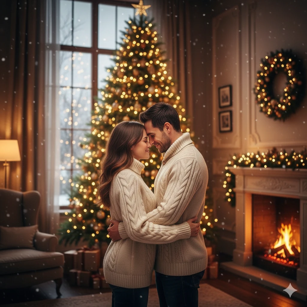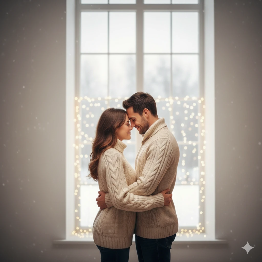 A cozy indoor New Year hug near soft fairy lights, warm lighting, comfortable sweaters, emotional winter aesthetic, natural and realistic look.