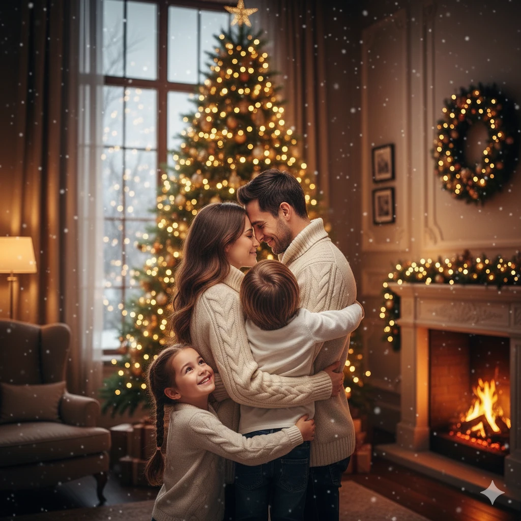 A heartwarming New Year family hug scene, warm indoor lighting, emotional smiles, cozy home atmosphere, realistic winter celebration photo.