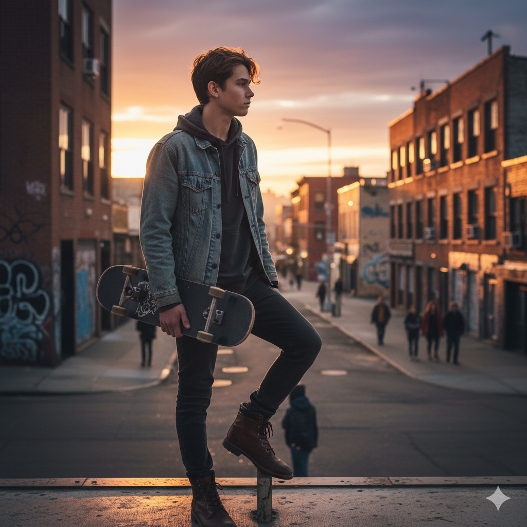 “A stylish teenage boy, confident expression, soft natural lighting, modern streetwear fashion, urban background, 85mm portrait lens, cinematic color grading, 4K realistic photography”
