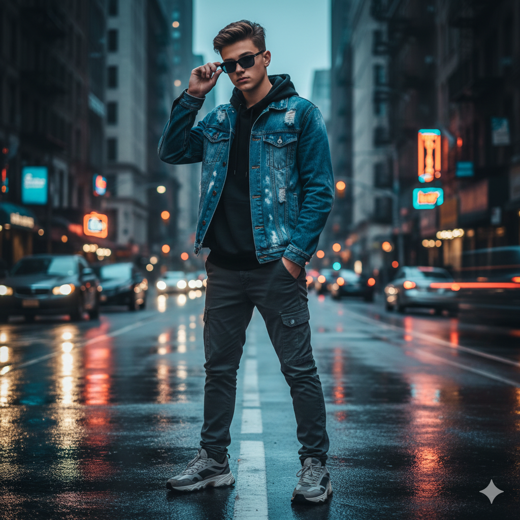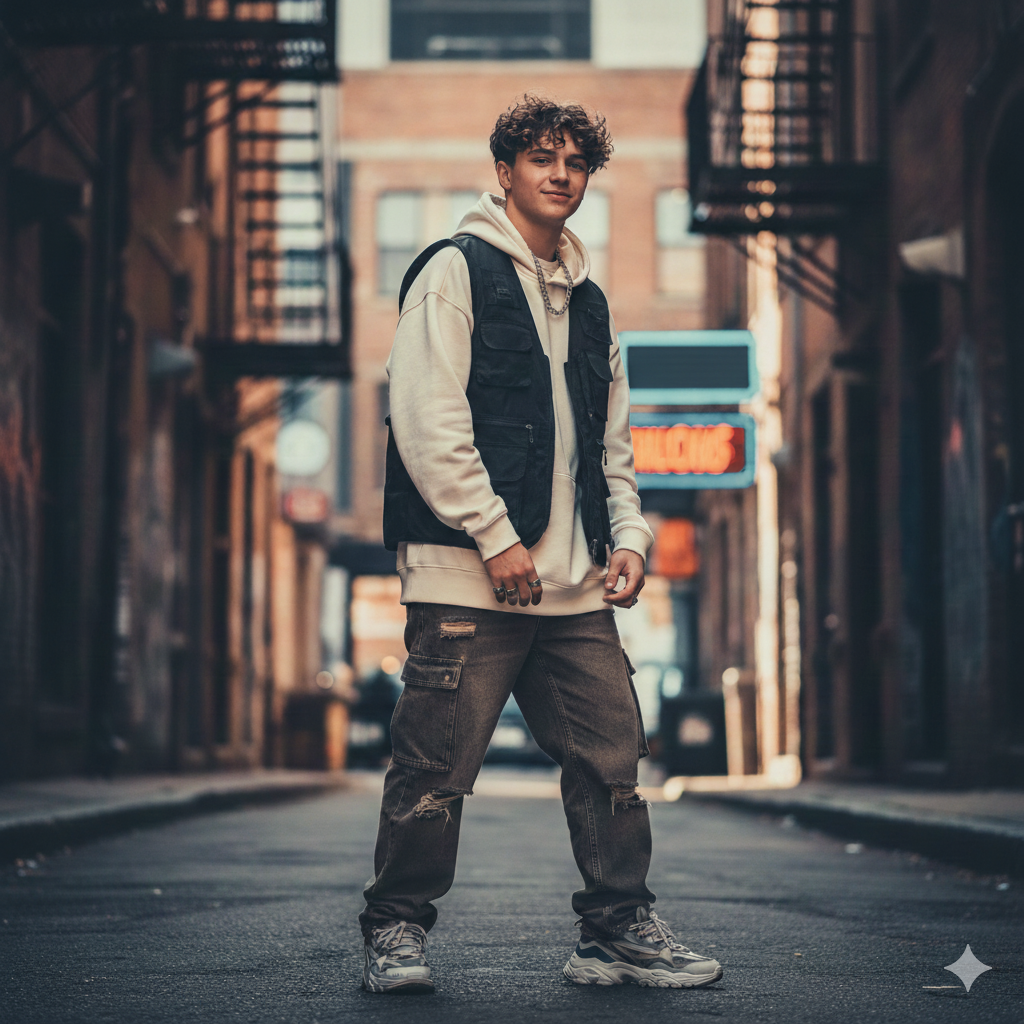 “A stylish teenage boy with confident pose, urban street background, moody lighting, high-detail 4K photography”
