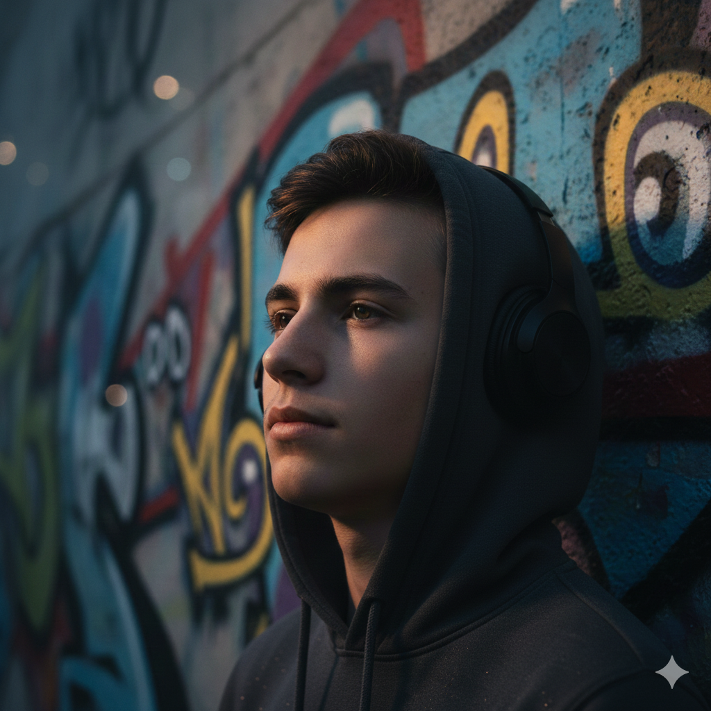 “Boy with headphones, graffiti wall background, moody lighting, cinematic shadows, ultra-realistic 85mm lens portrait”