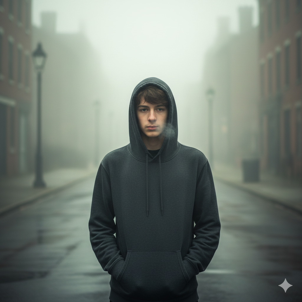 “Boy in hoodie, foggy street morning, soft cinematic lighting, shallow focus, realistic 4K portrait photography”