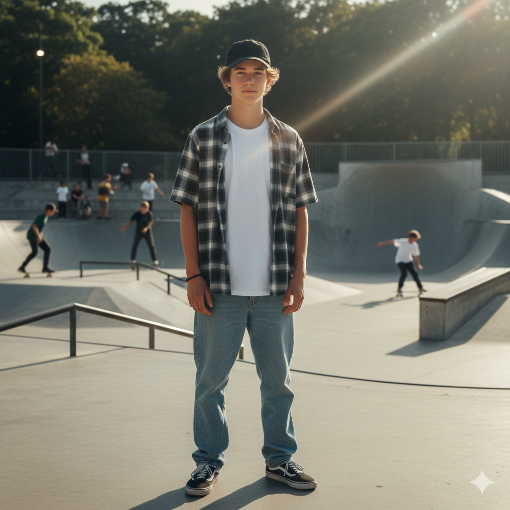 “Teen boy wearing cap, skateboard park background, cinematic lens effect, natural sunlight, realistic AI portrait”