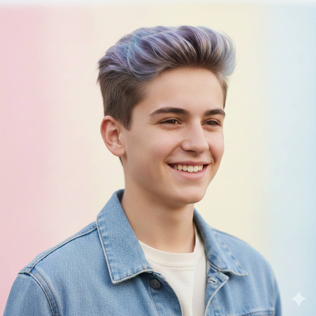 “Smiling teenage boy, pastel background, soft lighting, trendy hairstyle, casual jacket, realistic 4K portrait photography”