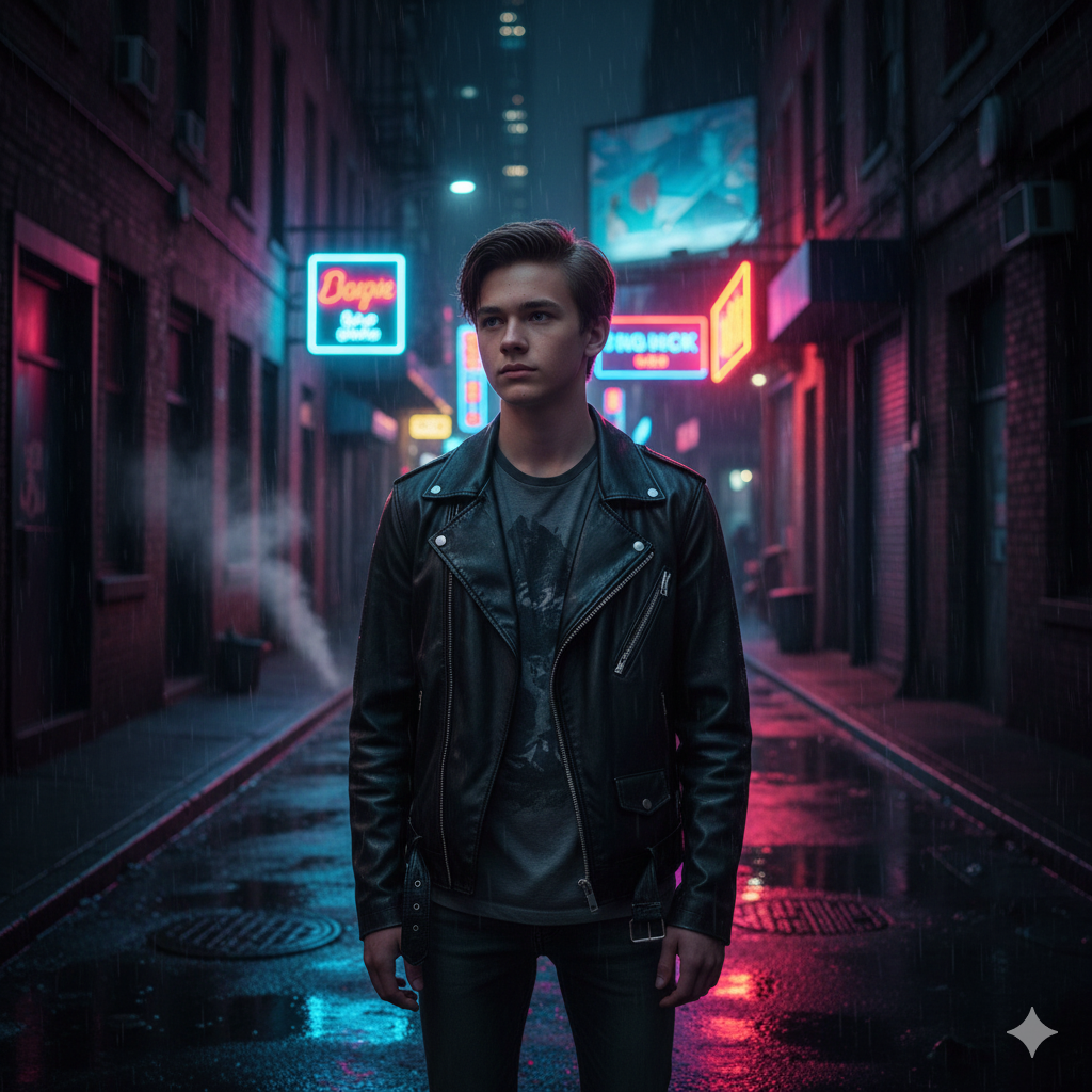 “Teen boy wearing leather jacket, dark street background, neon lights, cinematic moody effect, highly detailed portrait”