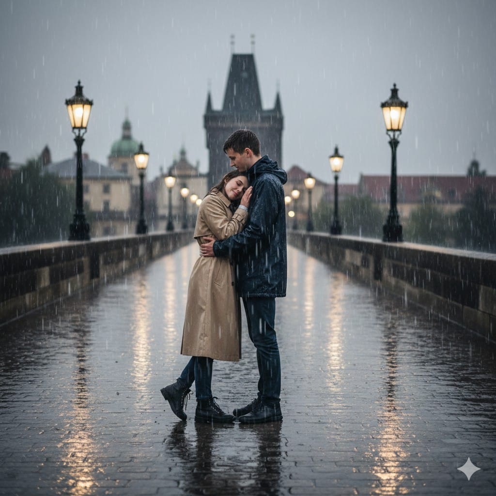 “Full-body portrait of a couple hugging on a long bridge during a gentle rain shower. Girl in a beige trench coat, boy in a navy jacket. Raindrops falling, reflective wet ground, soft grey sky, subtle cinematic rim lighting, water droplets on clothes, natural romantic expression, highly realistic 8K rain portrait.”