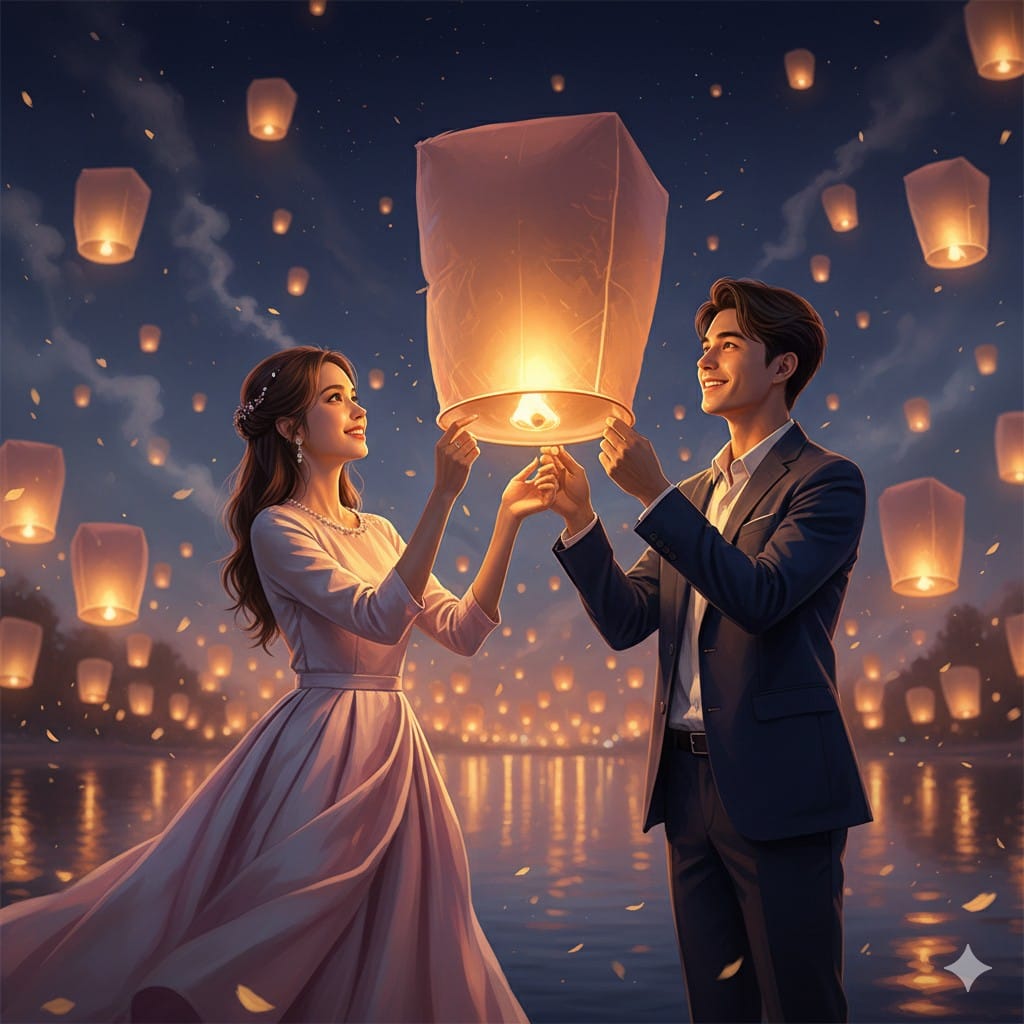 “Full-body portrait of a romantic couple releasing glowing lanterns at a night festival. Girl in a pastel silk dress, boy in a stylish blazer. Hundreds of lanterns floating in background, warm golden light illuminating faces, dreamy atmosphere, cinematic night tone, hyper-detailed 8K portrait.”